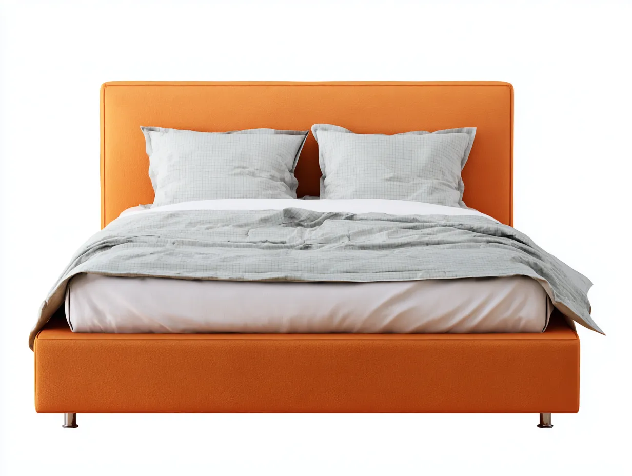 Lit double au design moderne avec revêtement en tissu orange et pieds métalliques. Idéal pour apporter une touche de couleur et de dynamisme à une chambre contemporaine.