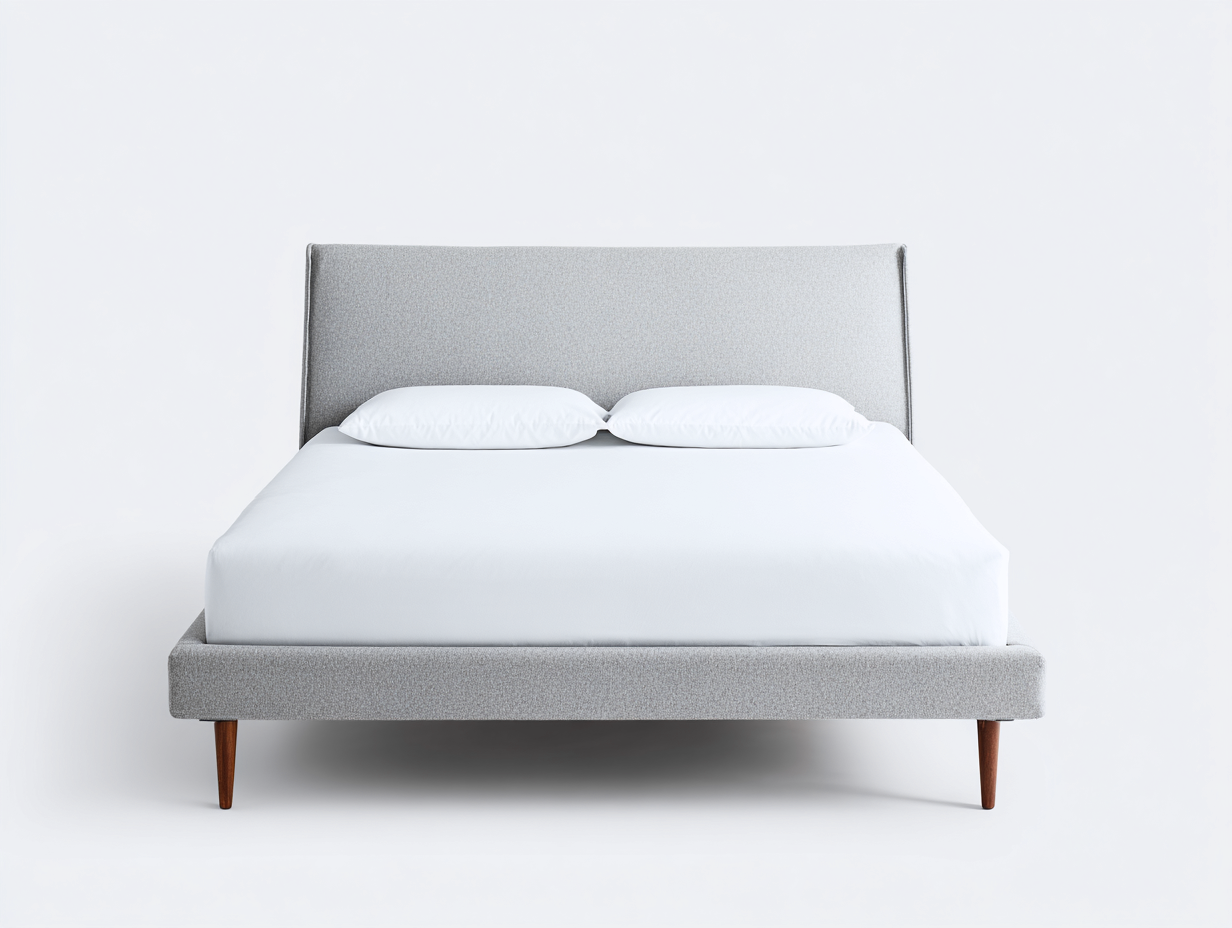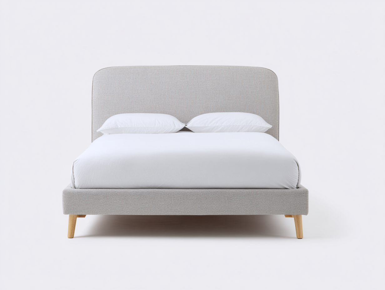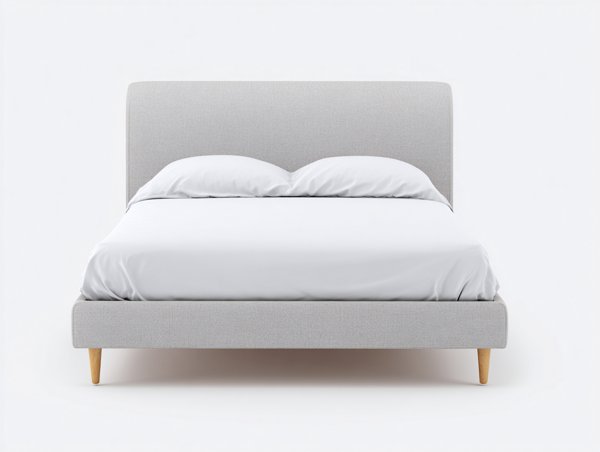 Lit double rembourré en tissu avec pieds en bois clair - 198x165x102 cm - gris clair - design scandinave minimaliste pour chambre