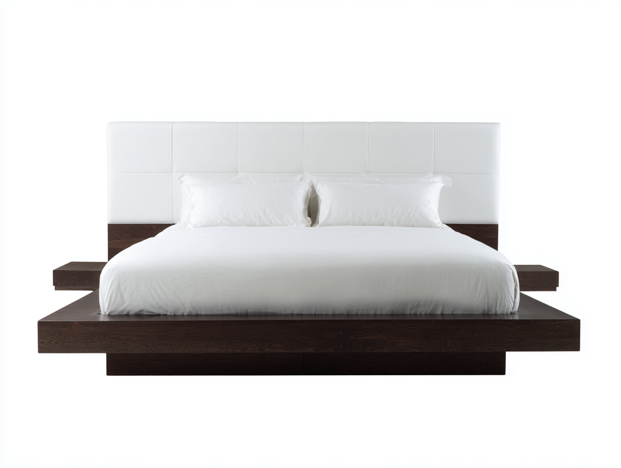Lit double au design contemporain combinant une tête de lit capitonnée blanche et une structure en bois foncé. Idéal pour apporter élégance et confort à une chambre moderne.