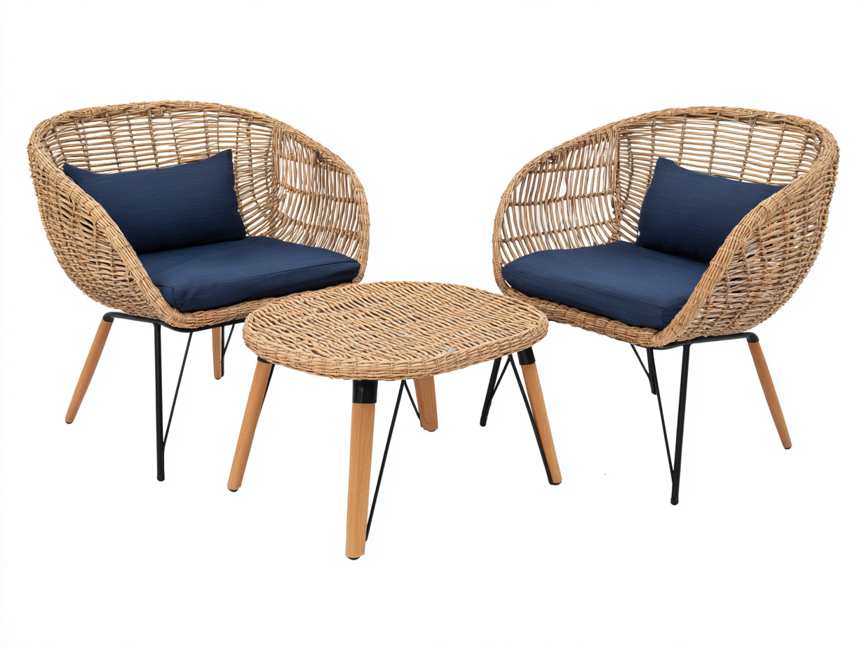 Ensemble compact adapté aux espaces extérieurs réduits. Assises confortables avec dossier enveloppant. Table basse ronde pratique pour accueillir boissons et objets du quotidien. Design harmonieux combinant matériaux naturels et modernes.