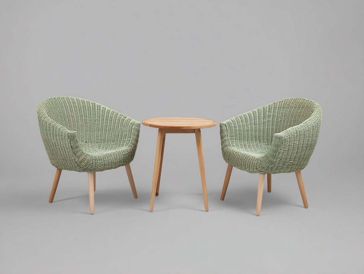 Salon de jardin 2 places composé de deux fauteuils et d'une table basse, parfait pour aménager un espace détente en extérieur. Son design en rotin vert avec pieds en bois apporte une touche naturelle et contemporaine à votre jardin ou terrasse.